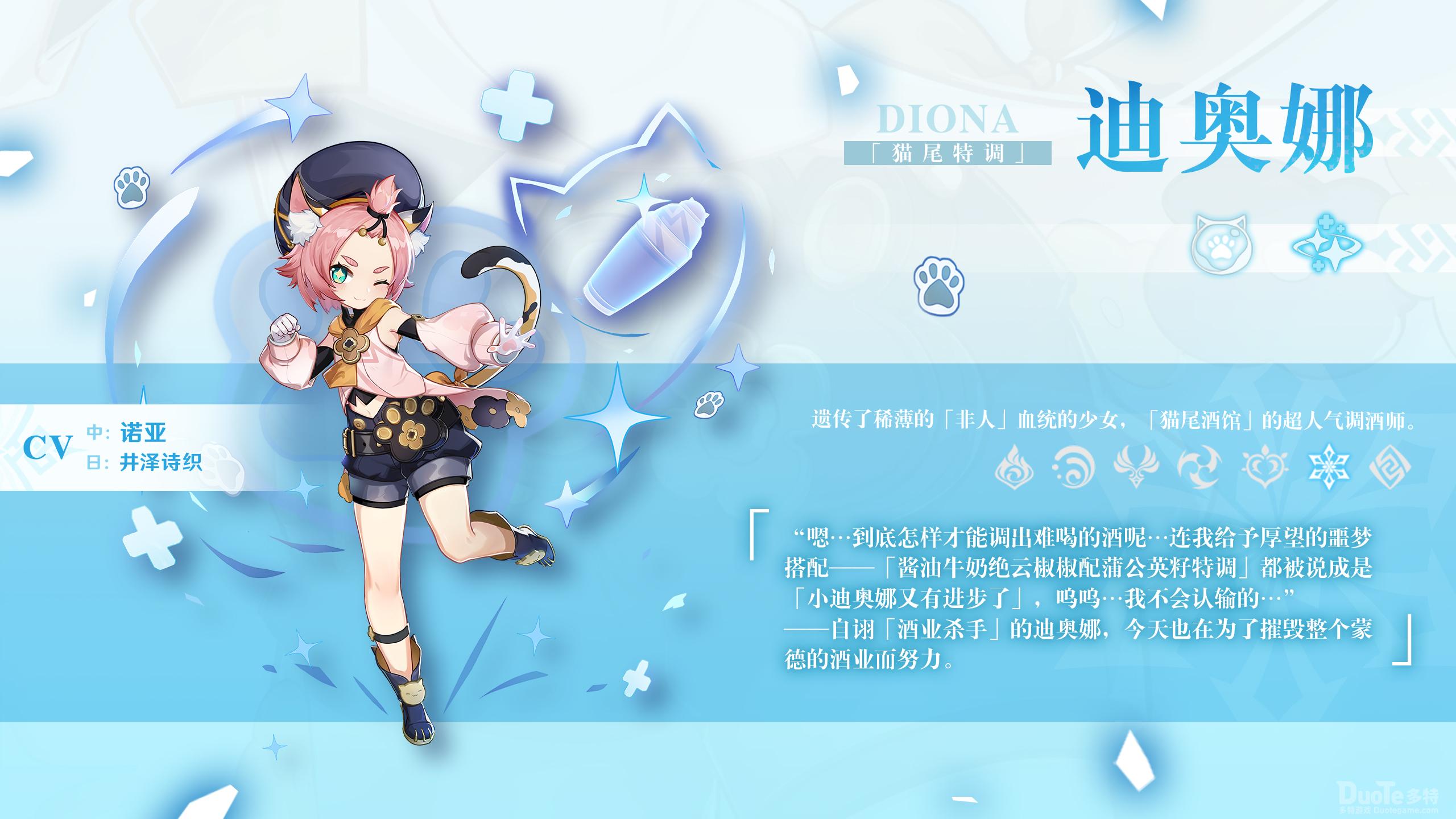 新版本还有两位全新4星角色亮相。迪奥娜,「猫尾酒馆」的人气调酒师,然而她其实并不怎么喜欢调酒,立志摧毁蒙德酒业。迪奥娜持有冰元素的神之眼,武器类型是弓箭,元素战技击中敌方会给自己产生一个猫耳盾。