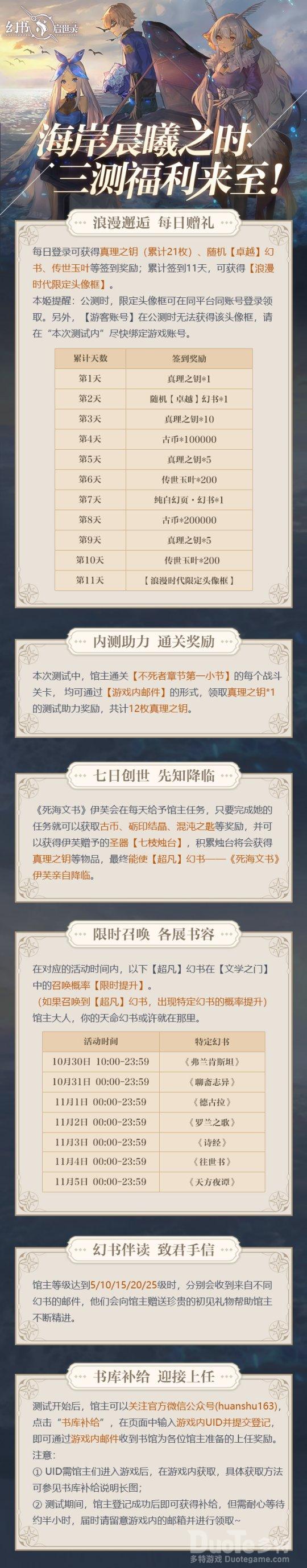 上任指引本次测试,还为馆主准备了超多三测福利,每日登录即可获得真理之钥、随机【卓越】幻书、传世玉叶等签到礼,累计签到11天,还可获得浪漫时代限定头像框!
