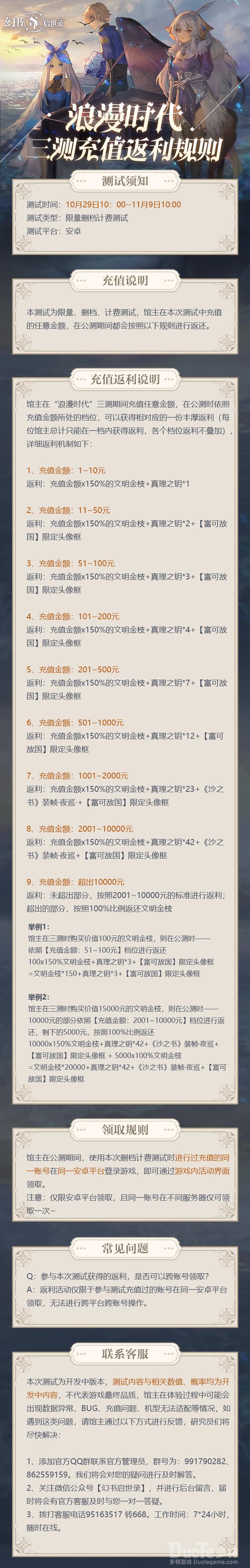 三测福利馆主在浪漫时代测试期间充值任意金额,公测时可获得相应档位的充值返还,详细返利规则如下!