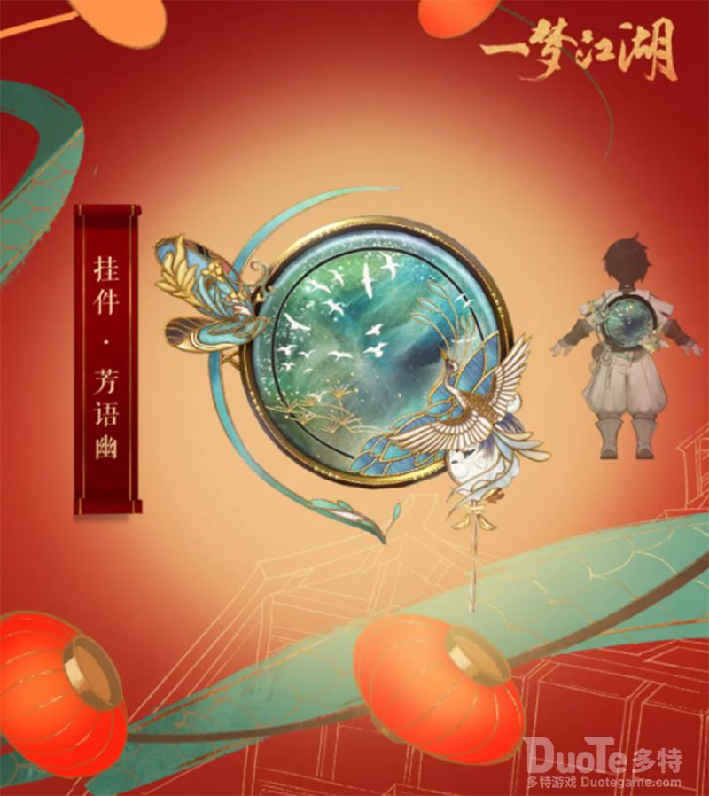 【“落花时节又逢君”,永久挂件免费拿】将江湖的山水背在身上!挂件·芳语幽描绘了一幅水光潋艳的山水美景!渐变的色彩中白鸟飞翔,而蝴蝶与仙鹤的搭配更是让挂件充满仙气。背上芳语幽,会让少侠与众不同的气质表现得更为淋漓尽致。少侠全程参与“落花时节又逢君”活动,获得与花酿,即可免费获得挂件“芳语幽”。