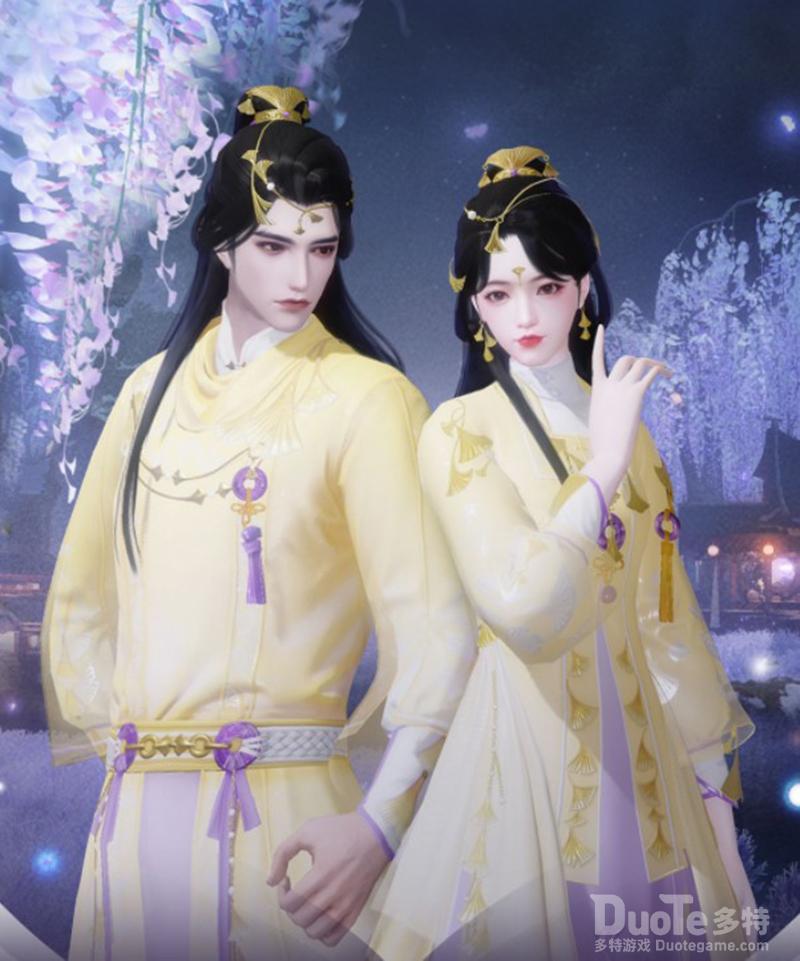 秋高气爽,云锦楼大师傅见纷纷飘落的银杏叶宛如落雨,心有所感,亲自裁出了这一件俏丽轻盈的“平仲欢”。整套衣服以鹅黄色为主,辅以紫色,轻纱间缀以金黄银杏,朦胧梦幻,少侠若是将这件新衣穿在身上,想必举手投足间都会诉说着浪漫潇洒的秋日之语!