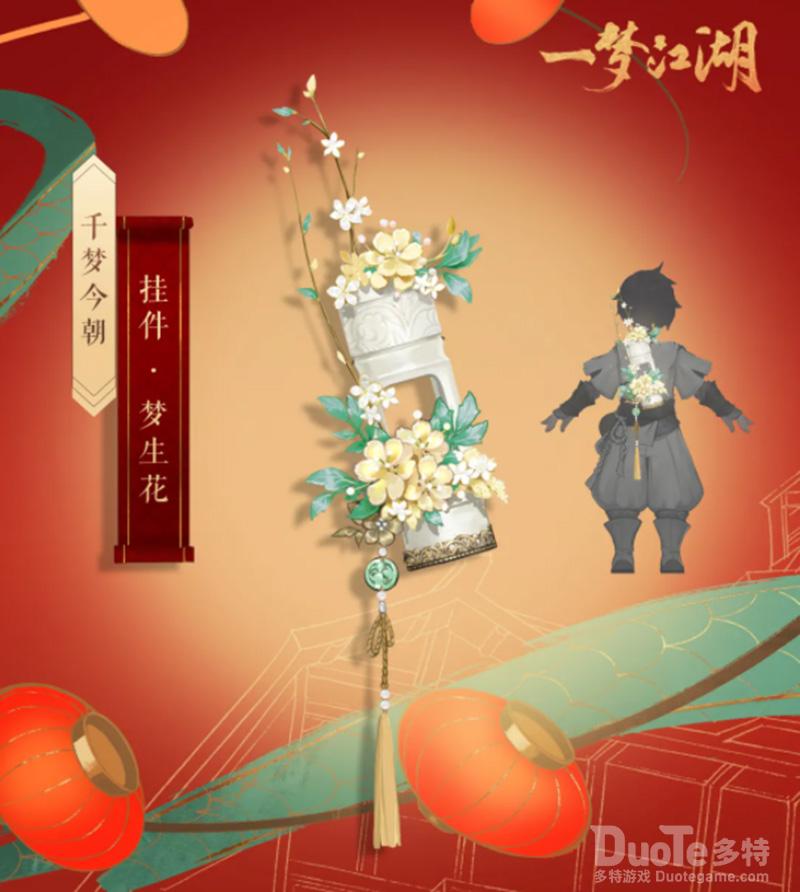 【“此间江湖”纪念任务,永久挂件“梦生花”免费得】芬芳十步之内,繁华九畹之中。挂件梦生花清新自然,黄色花朵和玉筒的搭配,缀以绿色树叶,精致巧妙,生机盎然。完成限时纪念任务“此间江湖”,将会免费得到永久挂件“梦生花”!