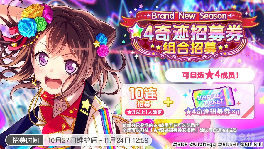 各位亲爱的BanG Dreamer:10月27日维护后,游戏内将开启「Backstage Pass 2」任务演出活动、★4出率双倍的「Dream Festival招募」、「Dream Festival·Special Set 10连」招募,以及可自选★4成员的「★4奇迹招募券组合招募」,并更新「★★★以上确定招募」!还将开展歌曲追加活动—连续3天·每天追加一首翻唱歌曲。