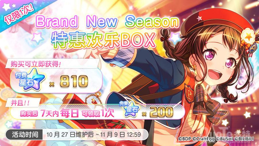 「Brand New Season特惠欢乐BOX」售价40元,购买后,可立即获得「付费星石×810」;此后7日可每日获得「免费星石×200」,最多可获得「免费星石×1400」!活动期间限购1次!