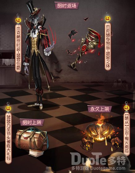在10月29日至11月4日活动期间,商城限时返场【杰克稀世时装-盛宴伯爵】【杰克随身物品-盛宴之杯】。限时上架【2020万圣节头像框大礼包】永久上架【[随从]小丑-鬼火南瓜】