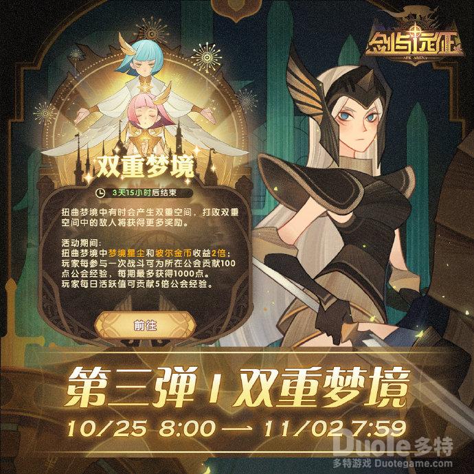 活动期间内扭曲梦境中梦境星尘和坡尔金币收益2倍;玩家每参与一次战斗可为所在公会贡献100点公会经验,每期最多获得1000点。