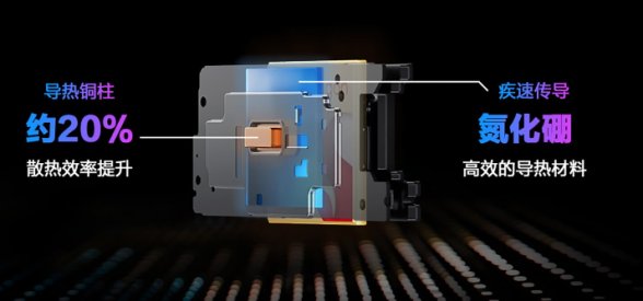 随着游戏画质的不断攀升,对手机性能提出更高要求的同时也面临更大的散热压力,ROG对此也在不断得迭代创新散热架构。此次全新升级的矩阵式液冷散热架构8.0在保持SoC中置架构的基础上,运用了独特的极速传导冷却技术进行高效散热,其通过在主板上打孔,并置入导热铜柱,可直接将SoC的热量传导至整个背面,再搭配氮化硼散热材质,整机的散热效率可提升20%,无论是短时激烈团战,还是长久游戏竞技,都能压制住SoC热量,实现持久满帧畅玩。