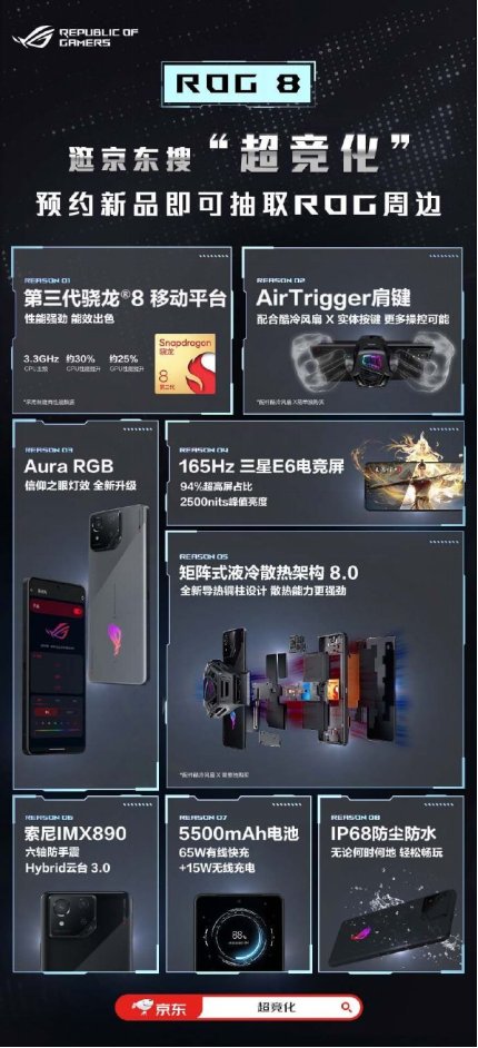 去年ROG 7系列凭借极致的性能释放、创新的操控玩法以及独家的游戏调校受到无数玩家的青睐。而今年全新的ROG 8系列在外观、性能、散热、影像等方面实现全维度升级,配置上搭载第三代骁龙8 Gen3旗舰移动平台,同时还配备了矩阵式液冷散热架构8.0、165HZ刷新率E6柔性屏、6轴防手震Hybrid云台3.0。外观工艺采用极简未来主义风格设计的同时加入了IP68级防水防尘,通过多年的技术布局以及高规格硬件加持,全系不仅可以实现酣畅竞技,还全面满足日常使用体验,再度为玩家打造一款标杆级电竞旗舰手机。