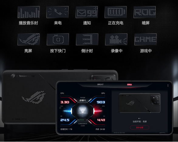 作为以用户体验为先的旗舰游戏手机,ROG 8系列在具备硬核游戏性能的同时,还全方位照顾到用户的日常使用体验。其正面采用2500nits峰值亮度的6.78英寸AMOLED 165Hz刷新率电竞屏,超窄边框使其屏占比达到94%,视觉体验更出彩。背面相较于前代更加简洁,五边形镜头+ROG LOGO+“Republic of Gamers”字标彰显潮酷,ROG 8 Pro则融入了AniMeVision 光显矩阵屏,能显示动态图案、文字,辨识度与个性化拉满。此外,全系在保留3.5mm耳机孔的前提下首次支持IP68防水防尘,赋予游戏手机更强的耐用性。