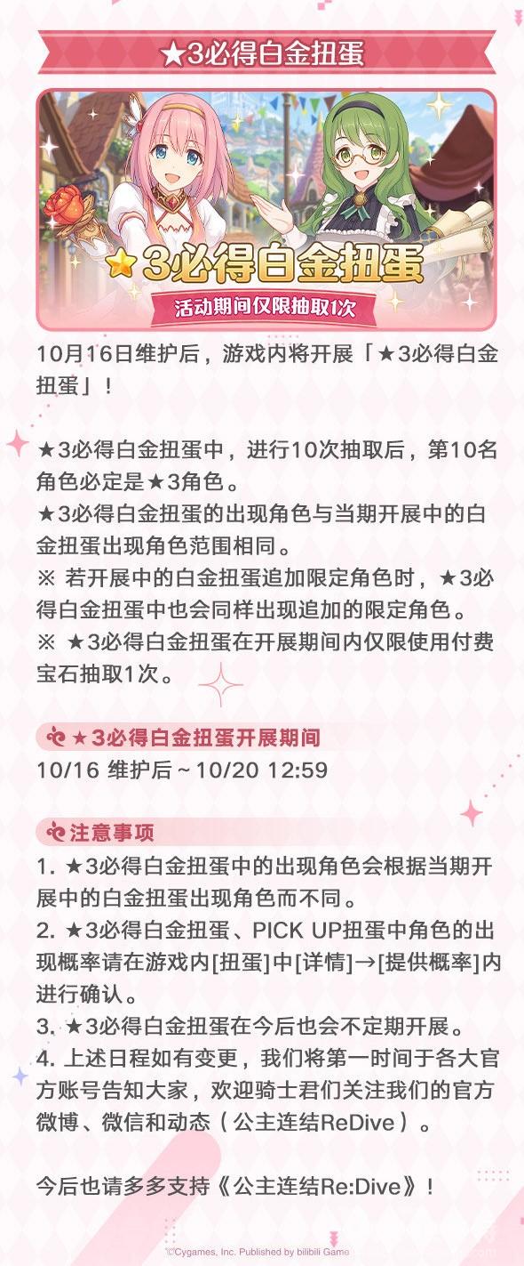 游戏内将同时开启「环奈」 PICK UP扭蛋活动,环奈的出现概率将特别提升为【1.4%】,为通常UP概率的2倍!还将限时开展「★3必得白金扭蛋」,上架全新礼包「公主之心碎片补给」与「新手骑士成长礼包」,并将追加更多半周年纪念优惠活动!
