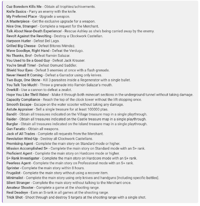生化危机4重制版即将推出,本作的奖杯有多少呢,相信很多玩家还不太清楚,那么下面小编给大家带来生化危机4重制版奖杯介绍,感兴趣的小伙伴一起了解一下吧。