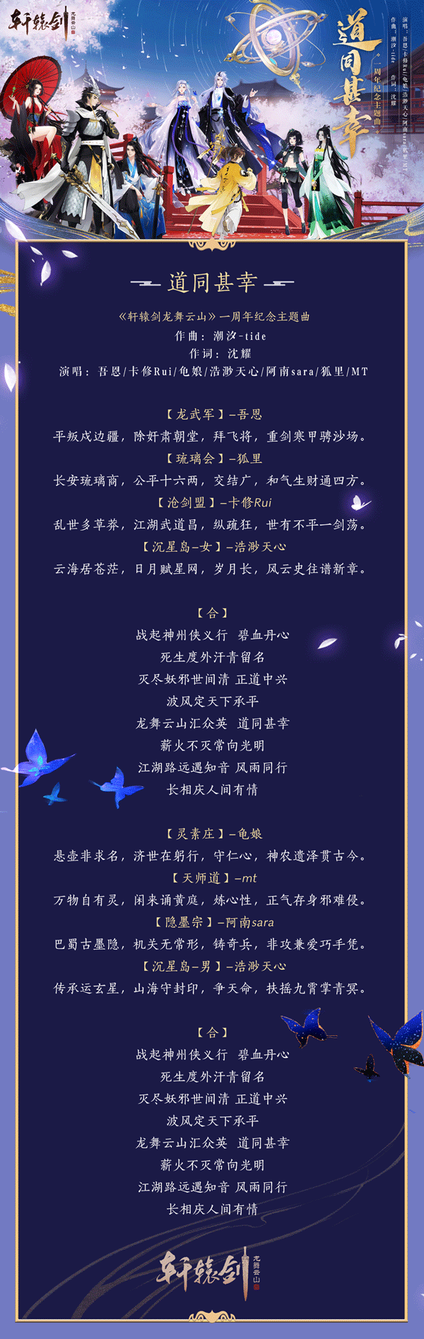 【豪华制作,致敬经典】《道同甚幸》由知名古风音乐团队“异新音乐”制作,作曲家潮汐-tide和词作沈耀联合打造,特邀吾恩、卡修Rui、龟娘 、浩渺天心、阿南sara 、mt、狐里七位实力歌手倾情献声。游戏经典原声融入高燃旋律,笛音箫韵间可闻刀剑出鞘,潇洒非常,尽显轩辕世界侠者豪情。