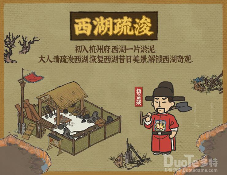 《西湖游览志》中曾记载:“西湖开浚之绩,古今尤著者,白乐天、苏子瞻、杨温甫三公而已。”其中明朝时期疏浚工作的代表人物即是杨孟瑛(杨温甫)。版本更新后,杭州府版本将新增“西湖疏浚”的新玩法,朝廷会委派杨孟瑛与玩家一同解决西湖中淤积的泥沙。