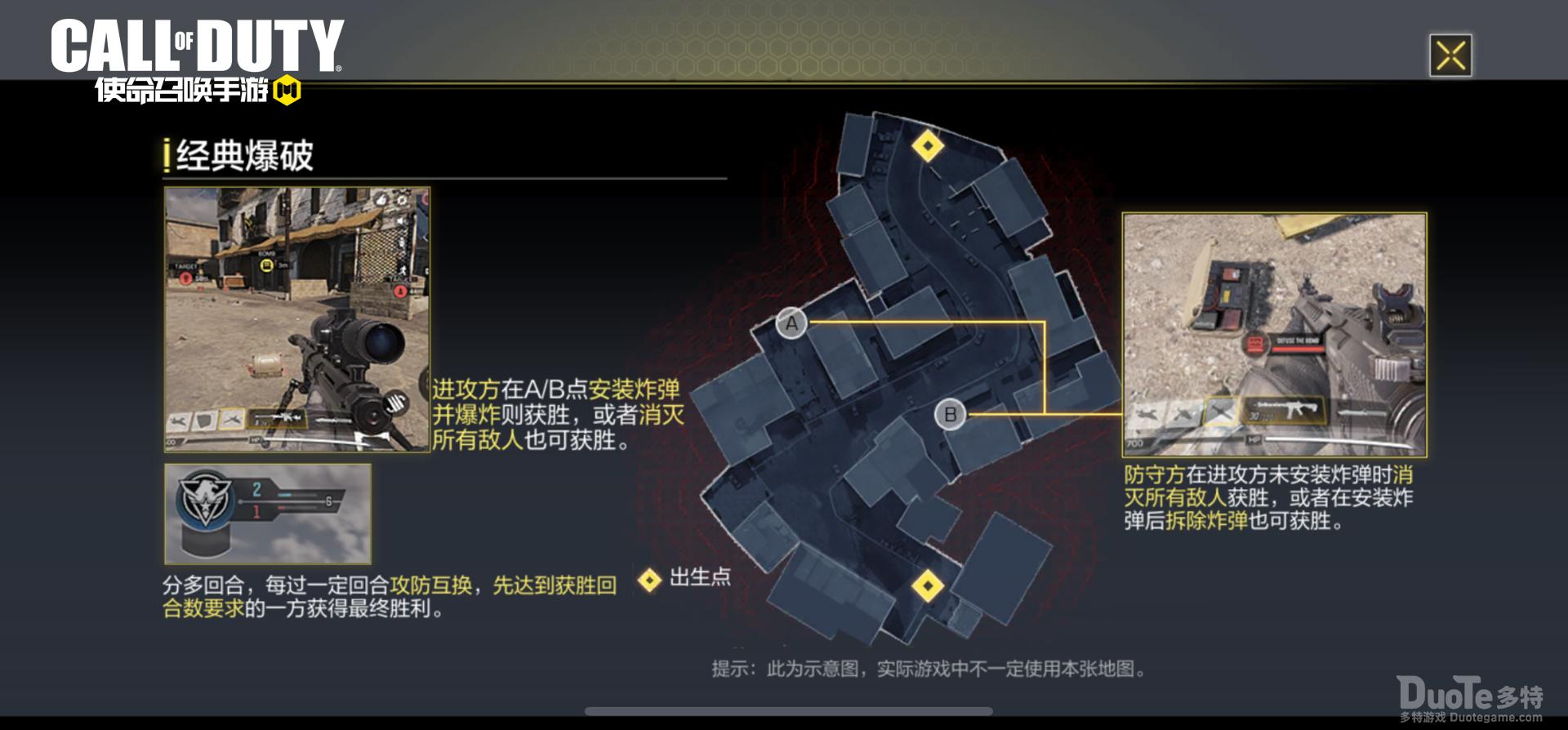 经典爆破:传统爆破模式,参与比赛的队伍分为进攻方和防守方,以炸弹装拆为目标。由于单局不可复活,因此整体策略性更强。该模式下引入了多回合制,一定的回合后攻守互换,先达到5回合胜场的一方获得最终胜利。此外,由于《使命召唤手游》中拥有呼吸回血及士兵大招等趣味设定,玩家对残局的处理上限更高,甚至可以打出漂亮的逆风翻盘,也是惊喜最多的模式之一。
