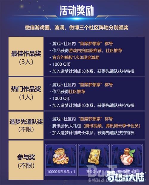 《梦想新大陆》“造梦计划”先遣队招募在微信游戏圈、波洞、微博社区三个社区阵地同步开放。只要造梦者对游戏有独到理解,按照活动要求发布作品投稿,就有机会获得丰厚奖励。活动结束时,除了普发参与奖和造梦先遣队奖励外,还将评选出限量最佳作品奖、热门作品奖,送上作品推荐及海量Q币等额外奖励。