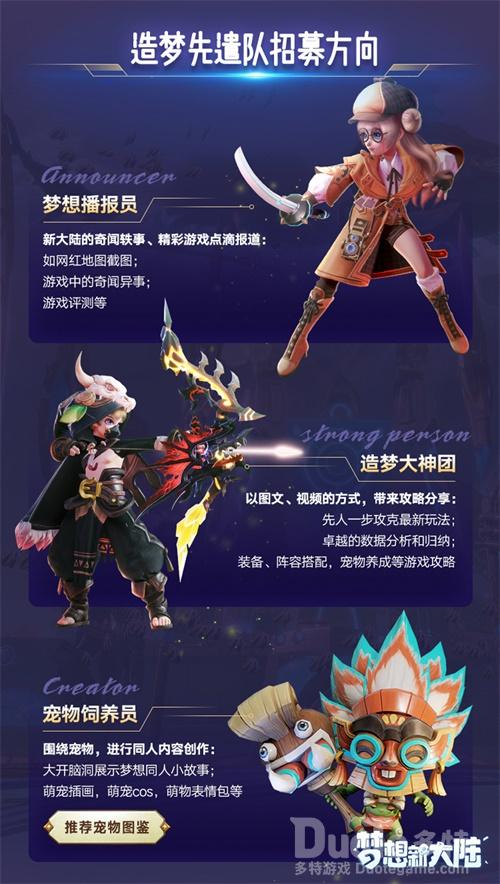 即日起至11月15日期间,招募包括“梦想播报员”、“造梦大神团”、“宠物饲养员”在内的“先遣队”探秘姆大陆,游戏评测、奇闻轶事、攻略分享以及围绕宠物进行同人内容创作等作品,都可以通过参与活动完成投稿,具体要求详见活动页面。