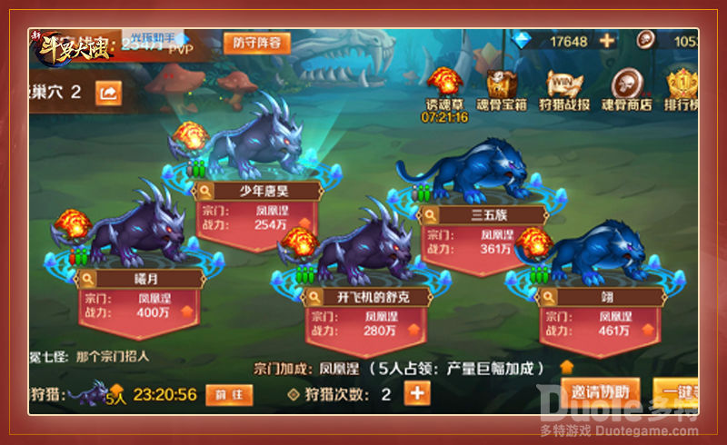 此处提示:邀请协助完毕,加时24小小时,诱惑草买4次。尽量找宗门5人一起的坑。3人起步有加成,5人收益最大化。因为刚进魂兽森林驻守,没有收益。所以关于魂骨如果细节处理,明天做详细解释。