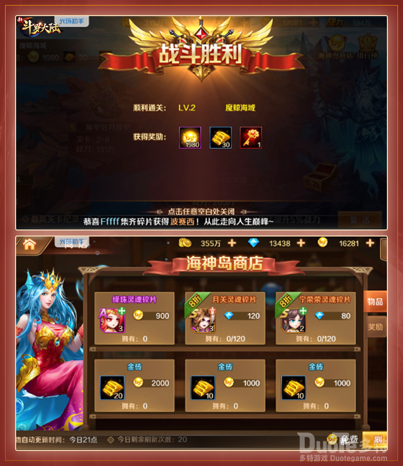 海神岛商店有我们紧缺的金砖,s蓉蓉碎片,s月关碎片,A+小白碎片,A+宁宗主。细节的收集商店,这是个好习惯。