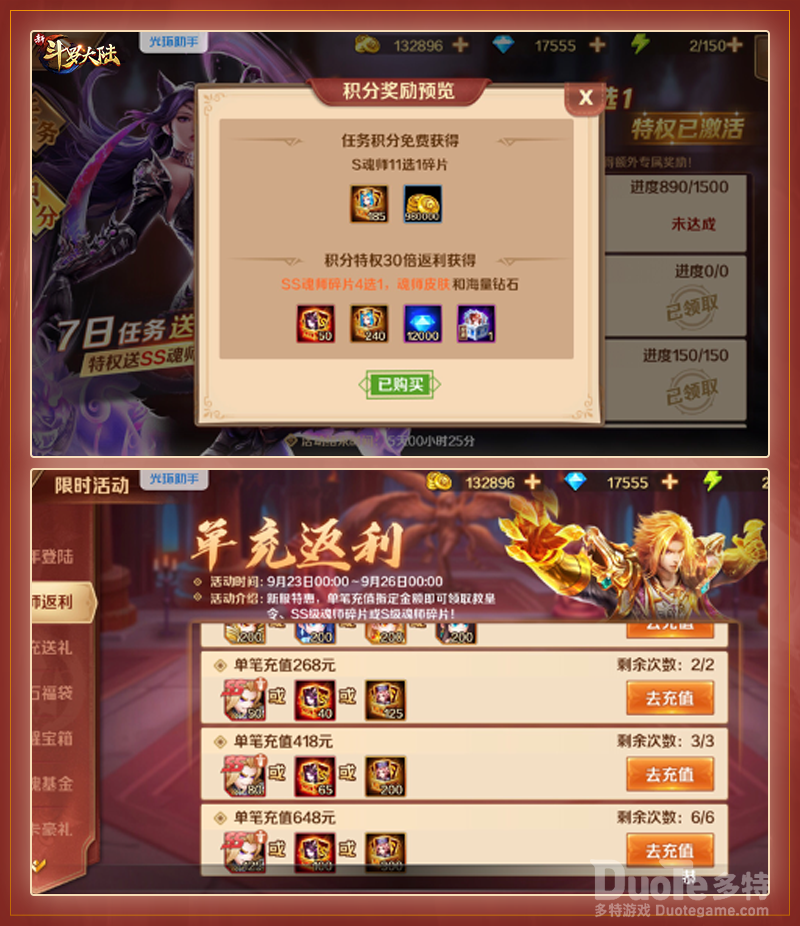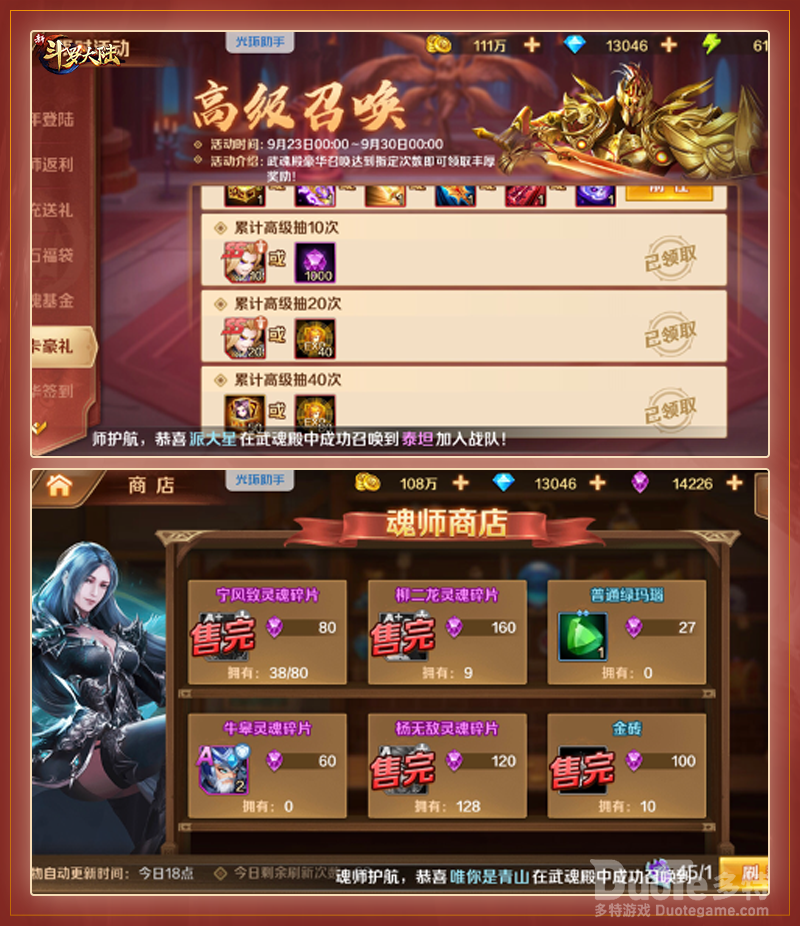 武魂殿:领取累充,邮件系统赠送。此时应该已经可以50+连抽了,抽到什么看运气,抽卡豪礼选择戴沐白,另外武魂殿1500分的奖励,个人建议也选择戴沐白。激活武魂基金以后5天内就可以出ss戴沐白。ps:可以提前别人2天出戴沐白。