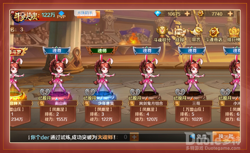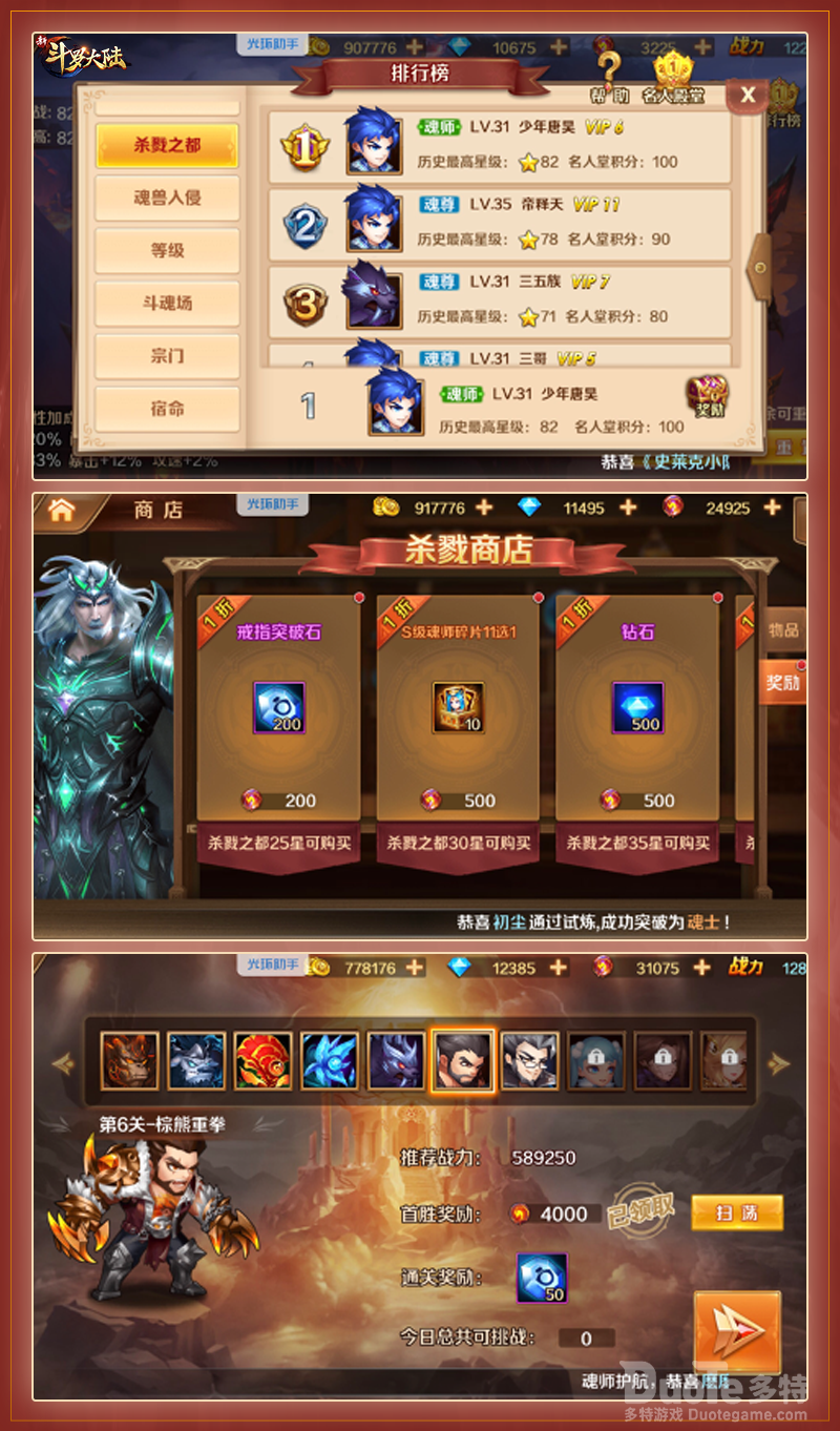 处理好包裹资源,最后再去斗魂场,往前打到最优的名次。同时别忘了防守新增一个人物,40级可以多上一个援助。