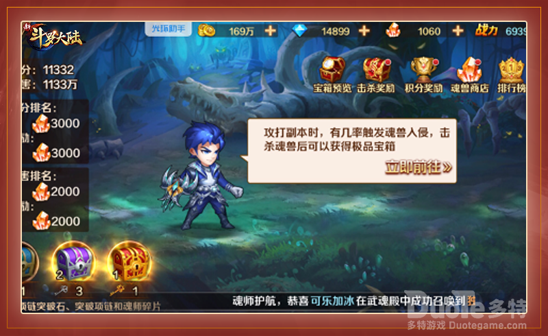 老规矩,先升级,突破装备为主。刷完10体,冲到40级。在刷副本的时候,个人建议单点刷体力,这样魂兽入侵的概率高很多,因为魂兽的血量是跟魂兽的等级直接挂钩,等级越高血量越高。可能到了这里会有人问,有什么用?来看下图。