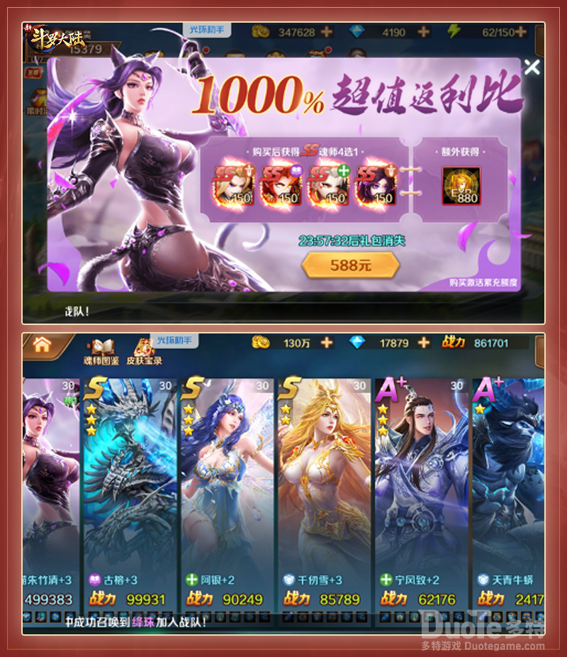 在这里分享一个小秘密,进斗魂场之前,我们先去点开商城,此时我们应该有2万+以上的钻了,先来个35连抽,新区第一天能抽到大把的s,A+,A饰品,A武器。戒指强化材料,戒指强化材料。深海沉吟,先把能觉醒的都觉醒了。先把人物武装到最强状态,然后再一鼓作气冲进斗魂场。拿下最高排名。