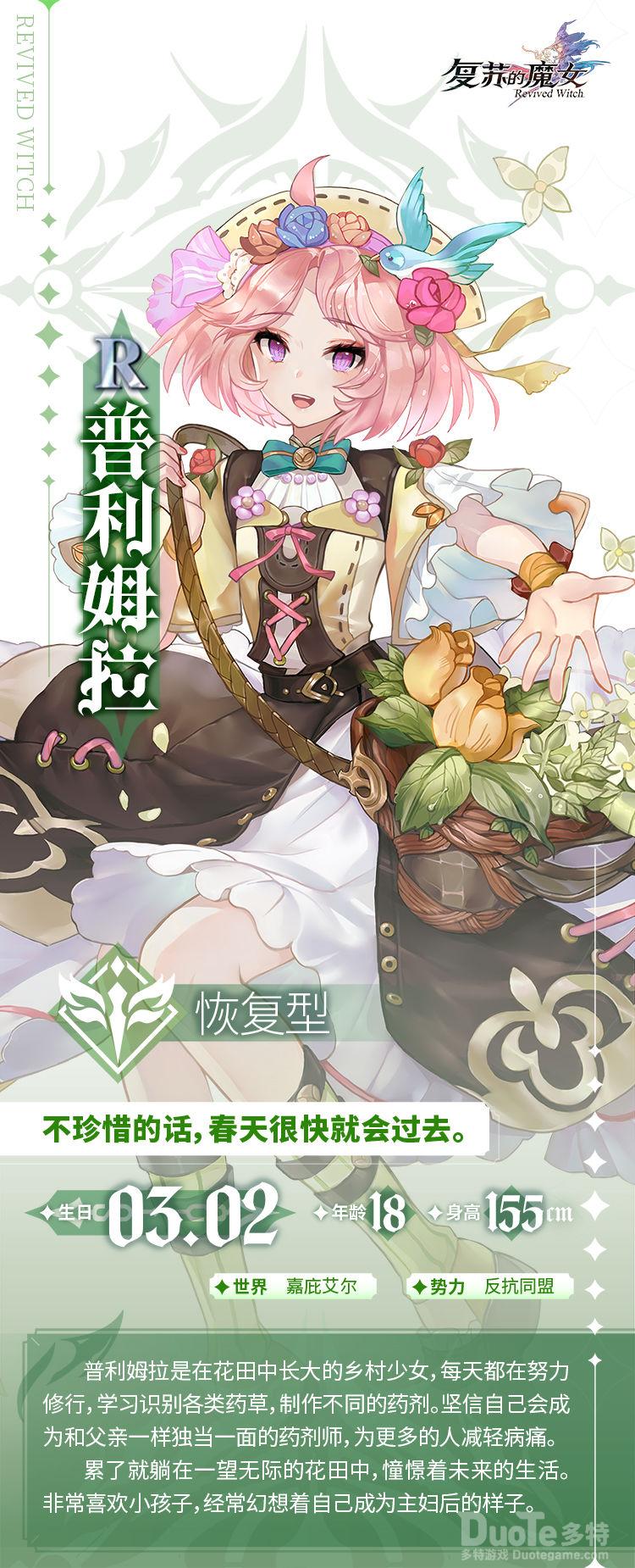 普利姆拉是在花田中长大的乡村少女,每天都在努力修行,学习识别各类药草,制作不同的药剂。坚信自己会成为和父亲一样独当一面的药剂师,为更多的人减轻病痛。