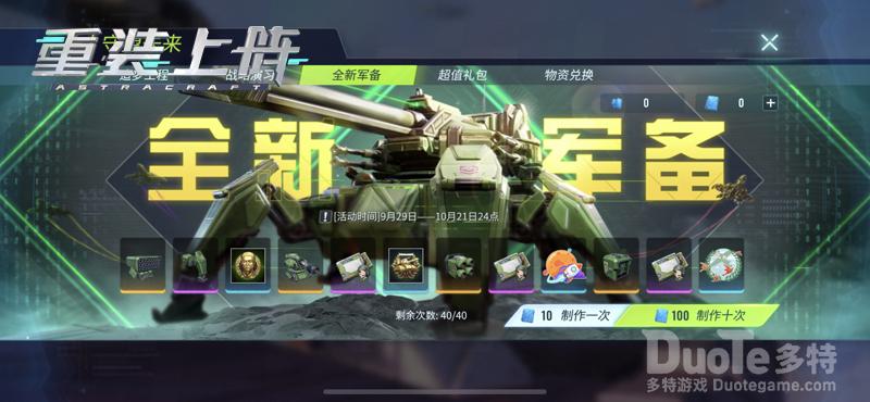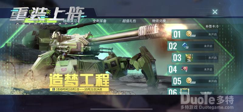 造梦工程开放,一起守望未来《重装上阵》“守望未来”系列活动里,漫游者们从10月1日开始就能通过“造梦工程”领取到丰厚奖励:每天登陆签到,就有星币、源石、全新头像及头像框等送上,第八天更有全新模块轻型履带“奔狼”领取!奖励到手后,也别忘了参与“战略演习”,活动期间将有两次演习任务发布,漫游者们只要完成任务就能收获大量源石、星币等奖励,更有获取全新军备的关键道具“蓝图”相送,让你换回心仪模块!