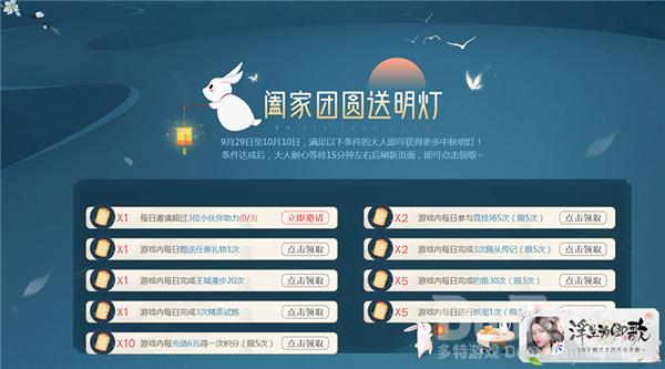 本次活动,阁下只要每日登陆签到就可以获得中秋明灯,并通过中秋明灯兑换福利礼包,内容包括元宝、时装兑换币、亲密度礼物等精美的道具。不仅如此,活动页面还有大量日常任务,可以获得数量不俗的中秋明灯,可加快阁下兑换奖励的进程,一次解锁大量精美好礼!