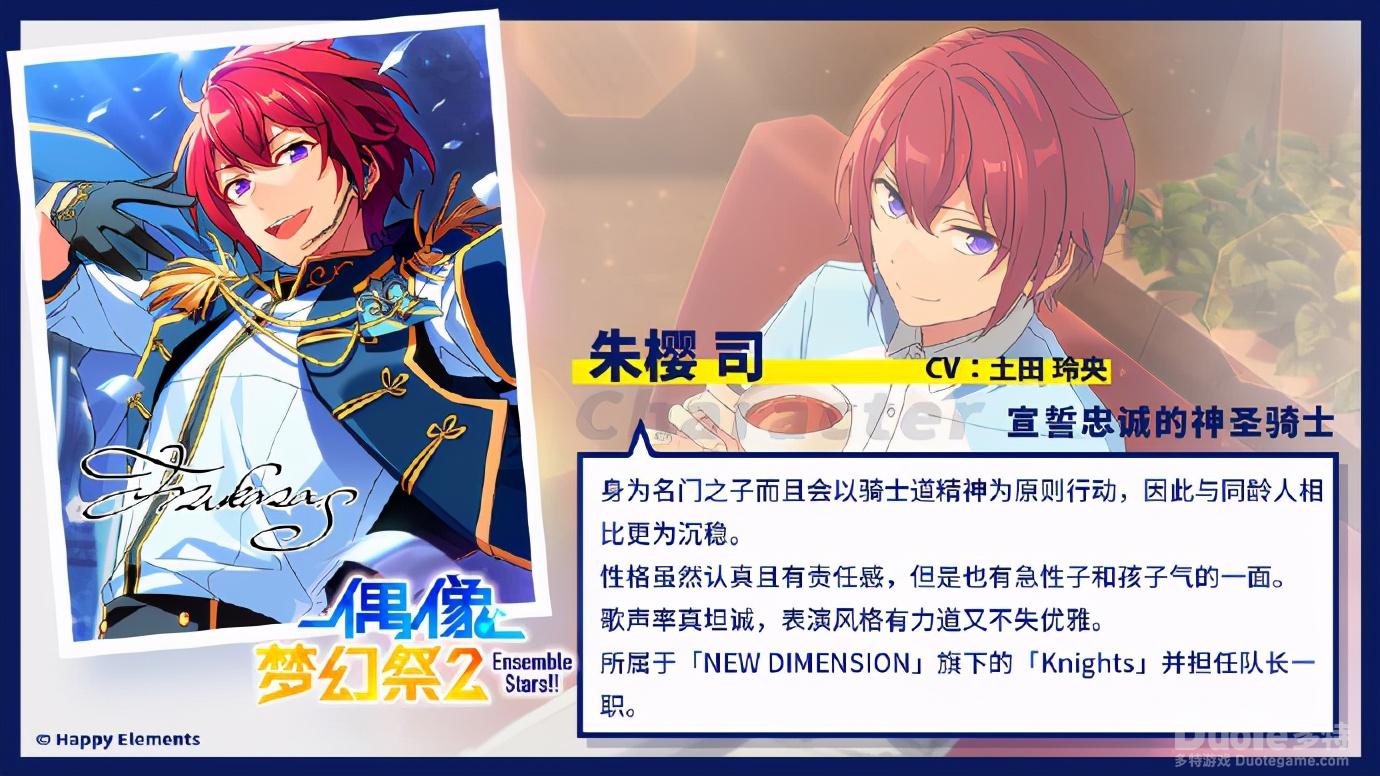 在由乐元素开发的音乐节奏手游《偶像梦幻祭2》中,宣誓忠诚的神圣骑士朱樱司在制作人们中有着很高的人气。下面就来一起看看朱樱司首次公开的个人档案,看他如何在这名为世界的战场上驰骋,立下无数战功吧!