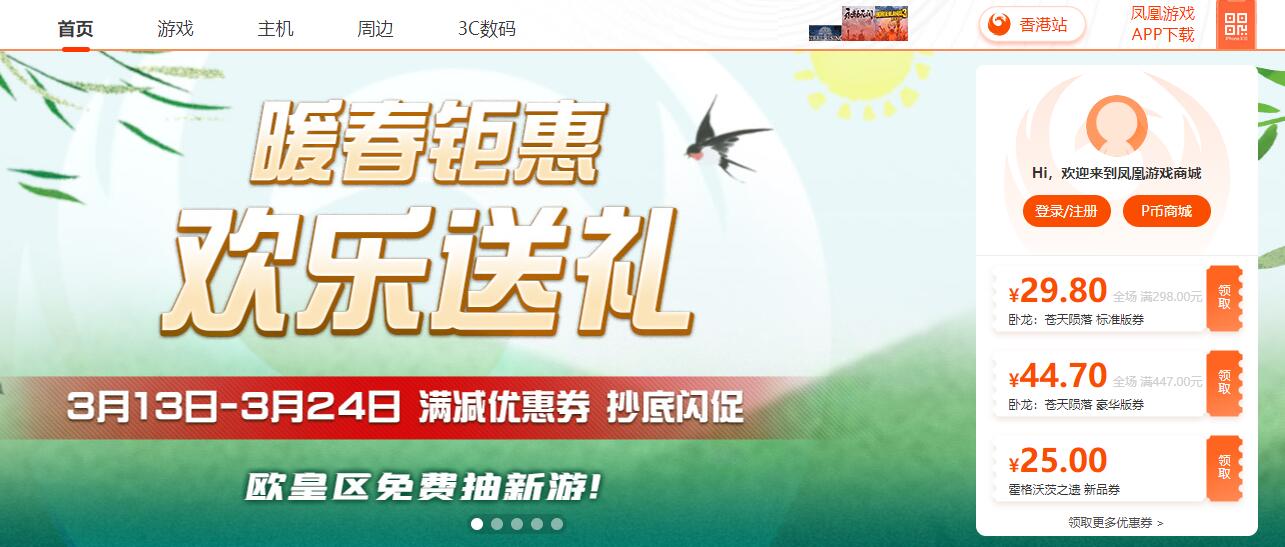 凤凰游戏商城除了有对即将发售的游戏的折扣外,还经常可以领取优惠券
