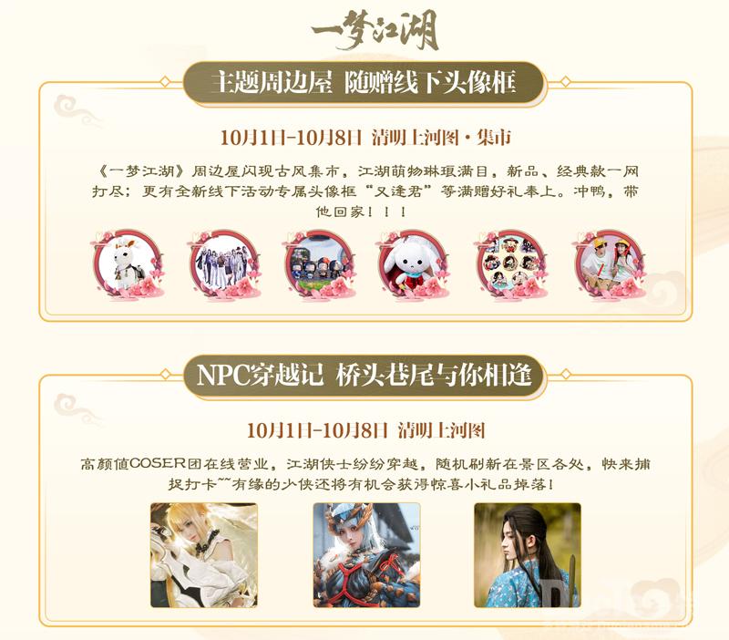 【周边屋开业 高颜值coser在线营业】10月1日至8日,《一梦江湖》周边屋闪现古风集市。江湖萌物琳琅满目,新品、经典款式一网打尽~线下购买周边还可以领到2020年的线下专属头像框“又逢君”!快来带你喜爱的周边回家吧!