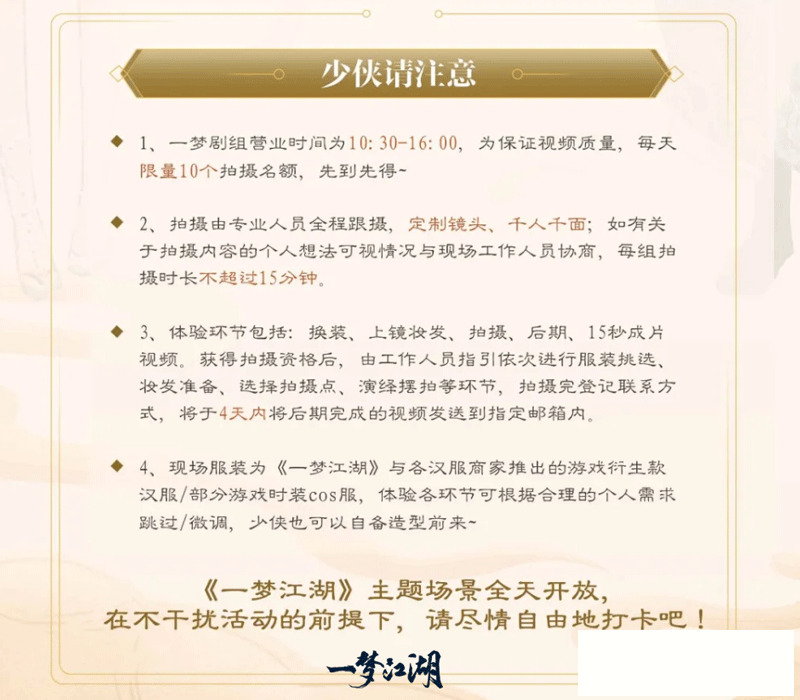 【拍摄活动注意事项】一梦剧组位于清明上河图景区的桃花岛区域,为保证视频质量,每天限量拍摄名额,先到先得~想参与本次拍摄体验活动的少侠,可通过出示游戏角色信息或者完成现场挑战获得资格。