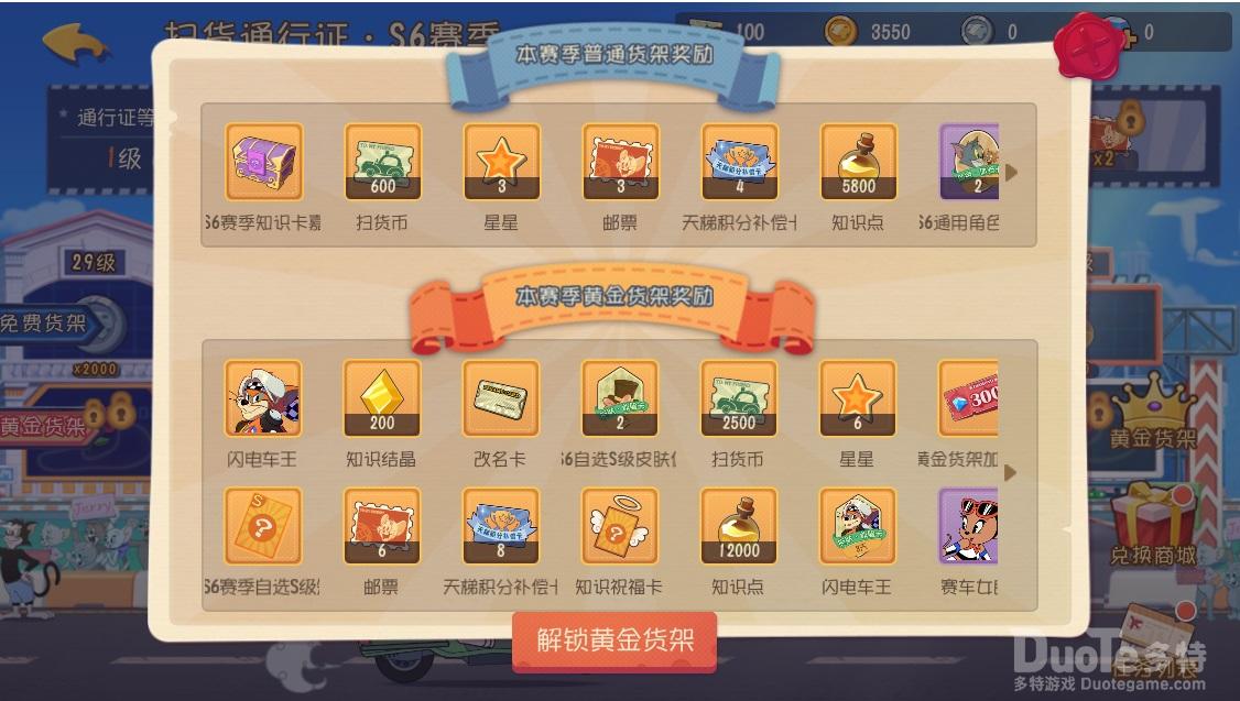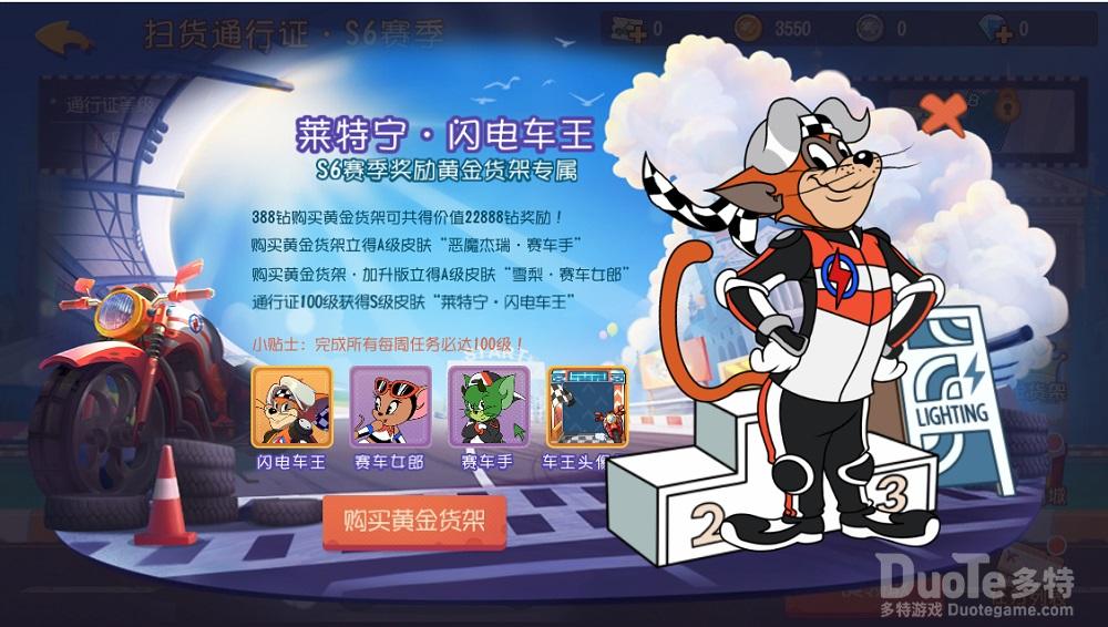 此外,升级为黄金货架,通行证等级达到100级时,即可解锁S6限定赛季货架皮肤“莱特宁·闪电车王”,为猫鼠追逐的欢乐舞台带来风驰电掣的速度与激情!