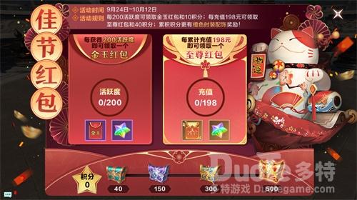 活动规则:在活动期间内,每累加200活跃度,或每充值满198元,即可来此领取对应的红包及积分;累加积分满足条件,即可领取对应宝箱奖励,最高可领取橙品时装头饰:金月玉兔(30天)