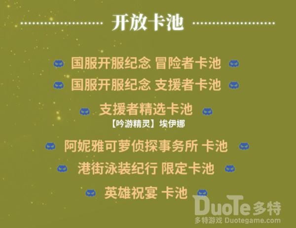 卡池方面,国服开服将开放六大卡池,除了两大国服纪念卡池、支援者精选卡池外,港接泳装纪行、英雄祝宴等卡池也会同步开放,确保玩家能抽到更多的角色(老婆)!