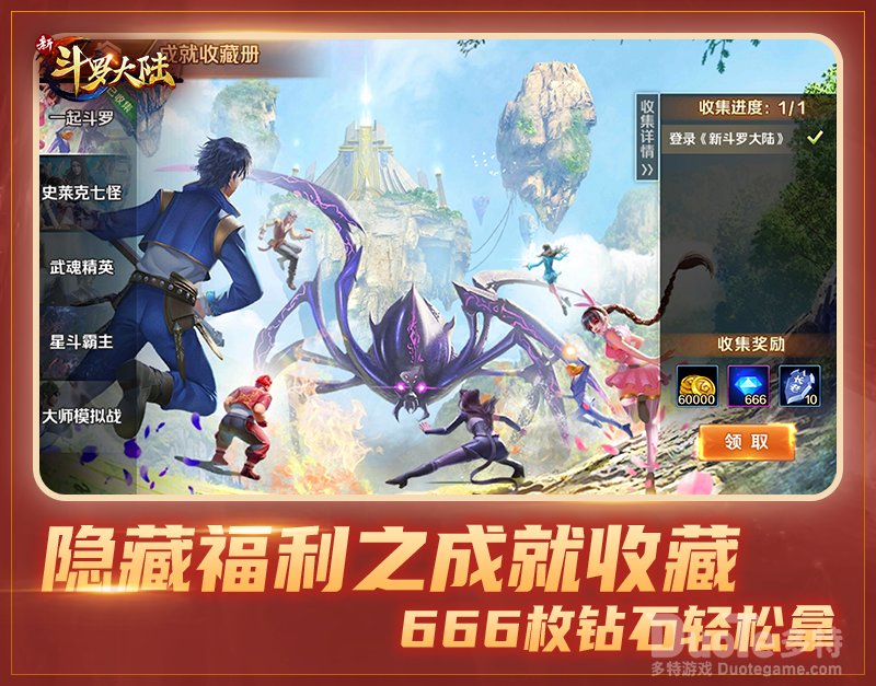 隐藏福利之成就收藏,666枚钻石轻松拿《新斗罗大陆》的隐藏福利不仅多,而且几乎是无难度获取。下面再给大家来一个超简单的“赚钱”方式,那就是刚上线不久的成就收藏册玩法,