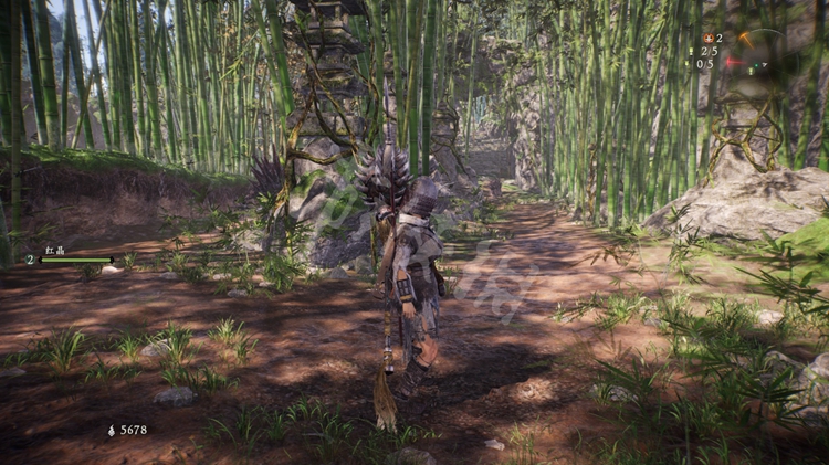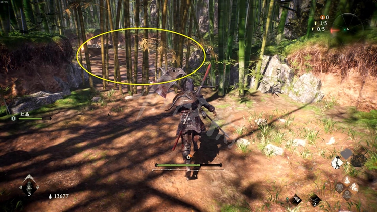 最右侧路口有些浅色的竹子挡住,破坏后即可通过,里面有个拾取物。