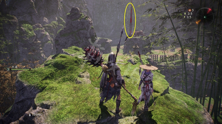 继续往上走,如下图位置的竹子可以砍掉。走到里面可以发现下方的一个旌旗点。
