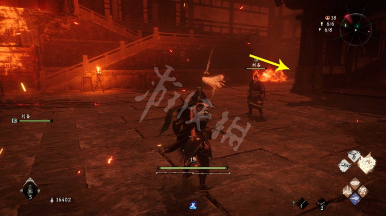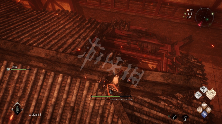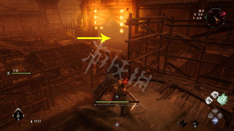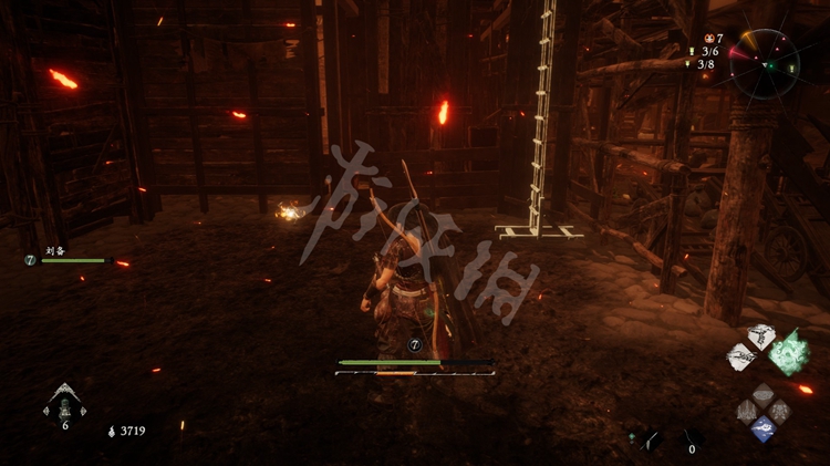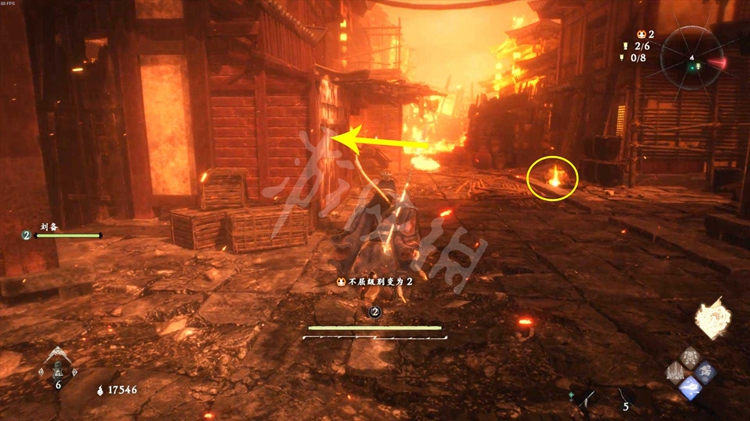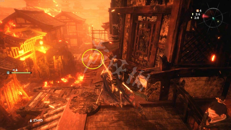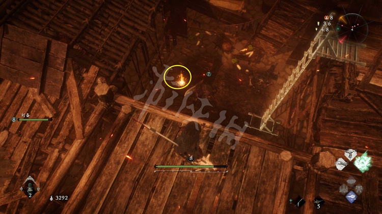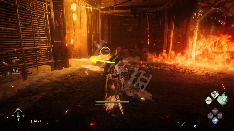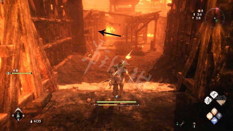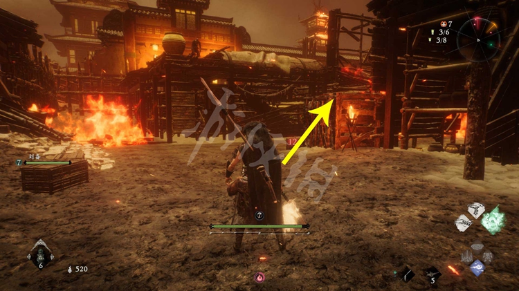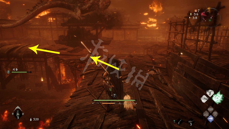 到达牙旗后,前面的墙壁爬上去可以推倒水缸扑灭下面的火焰。当然玩家也可以选择直接冲过火堆。