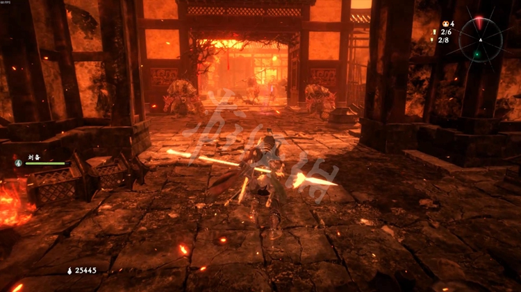 大门两边各有一条路,往右侧走爬上箱子,推翻水缸可以扑灭旌旗2的火势。