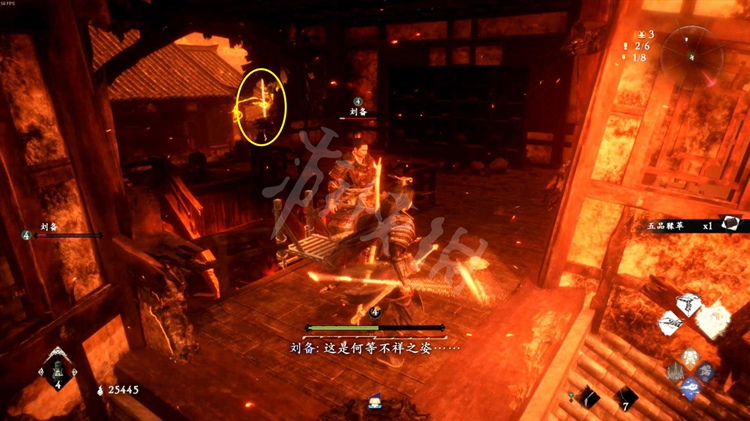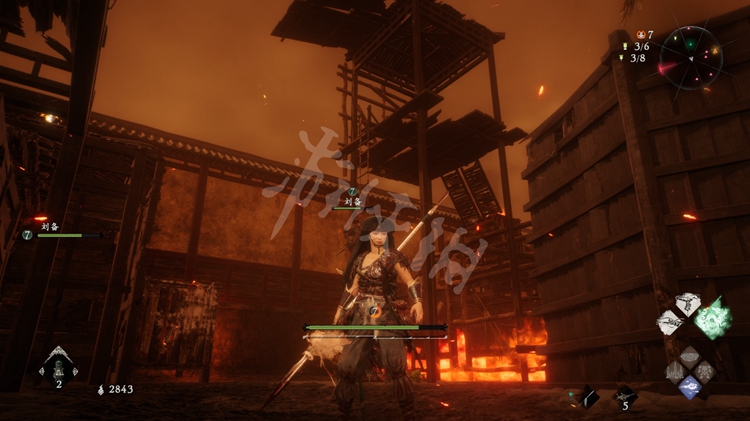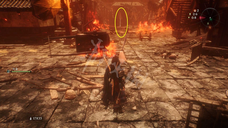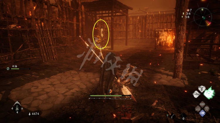 门口左右两条路,右侧有一个拾取物,左侧绕到后巷能发现一个旌旗点。旌旗立在火堆里,可以直接冲进去开。