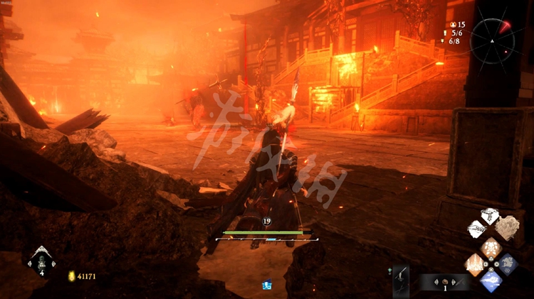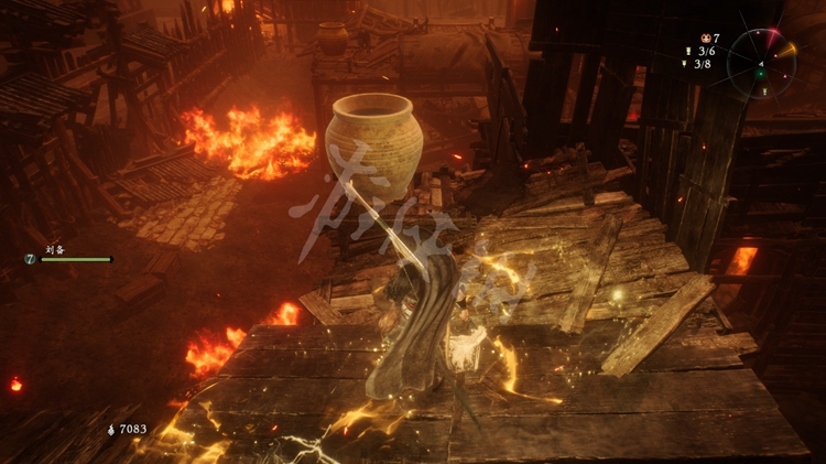 之后往城区方向走,跳到屋子上推下水缸扑灭下方的火势。