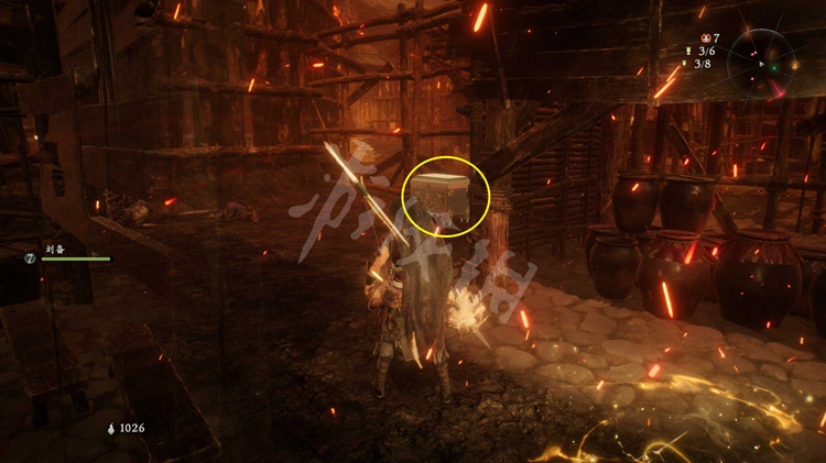 进去后继续往左边的角落拐。另外,附近的酒坛旁有一个宝箱。这个宝箱放心开,上面有木板挡住不会受到雷击。