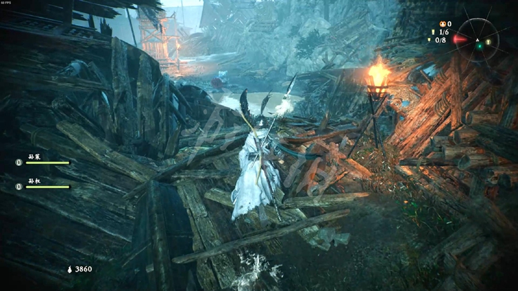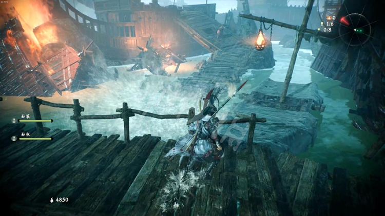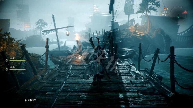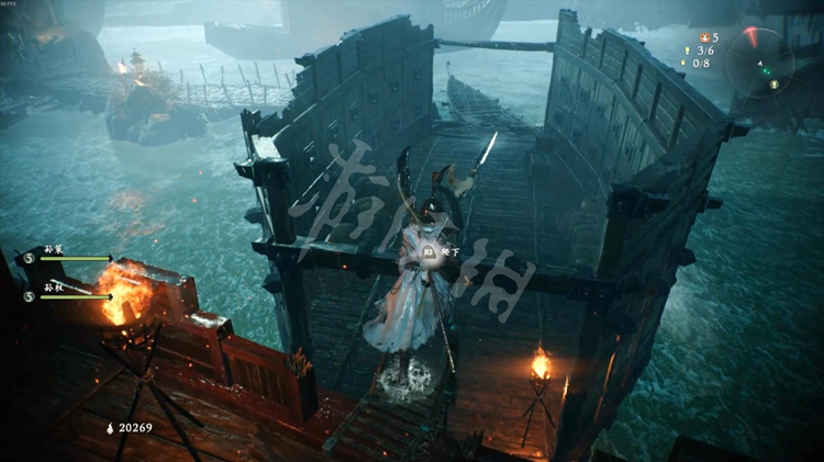 码头有个火把可以踢落,一旁的木船会漂到前面连通关卡起始区域。