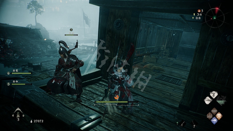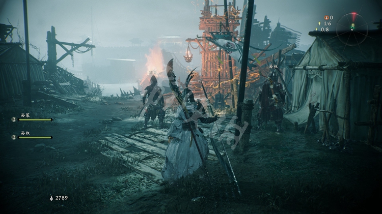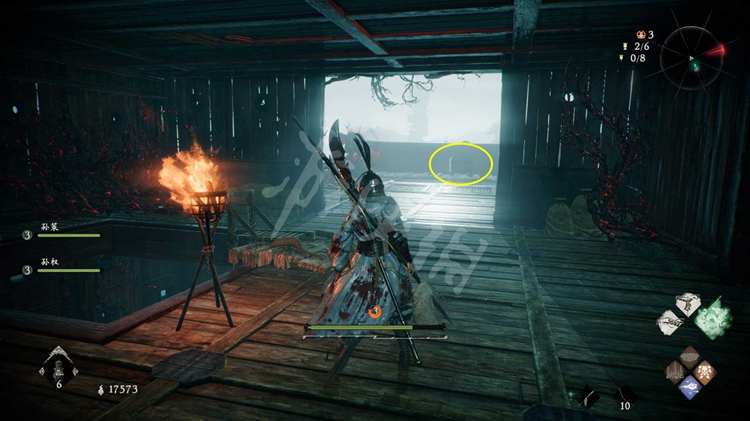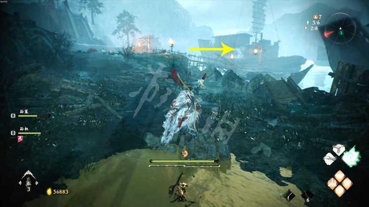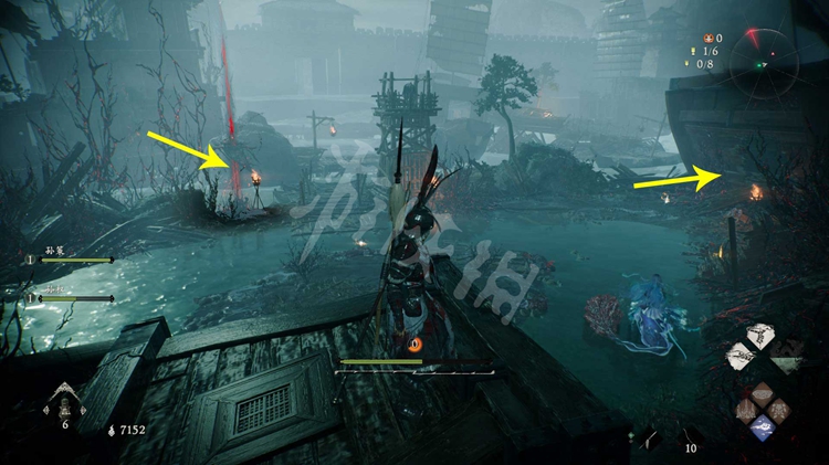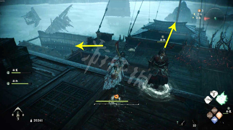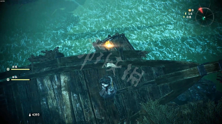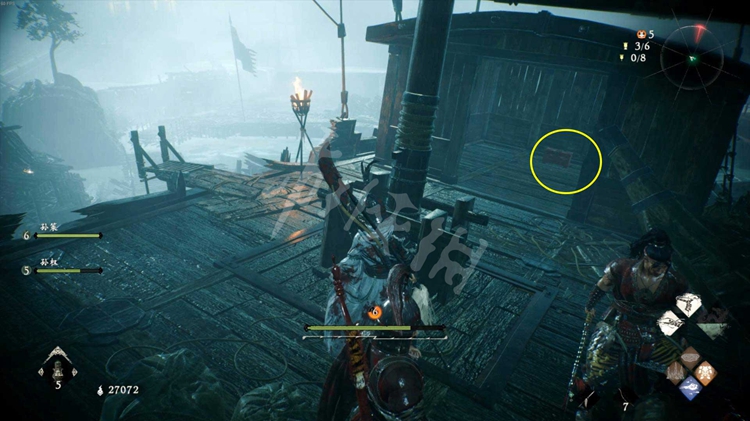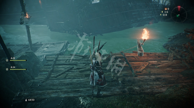 从楼船跳下去,能找到一个牙旗点。注意守卫牙旗的猪婆龙要走到画面右侧才会从地下窜出来。