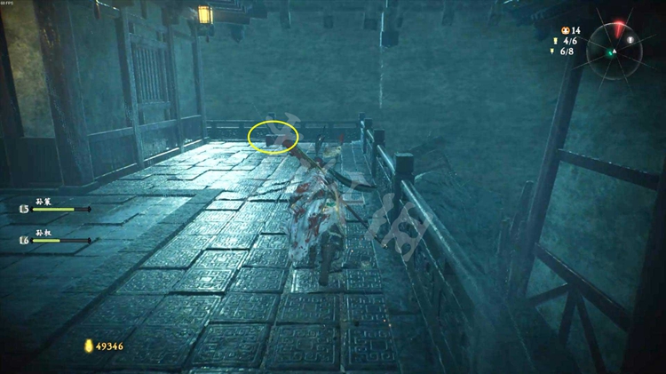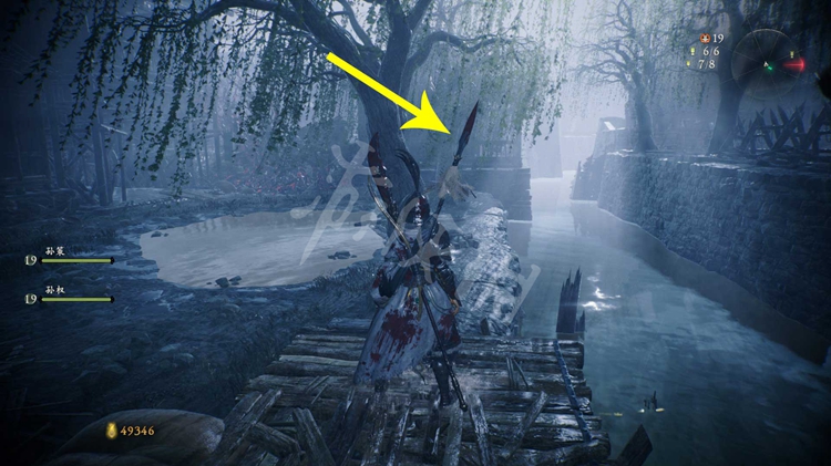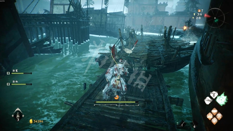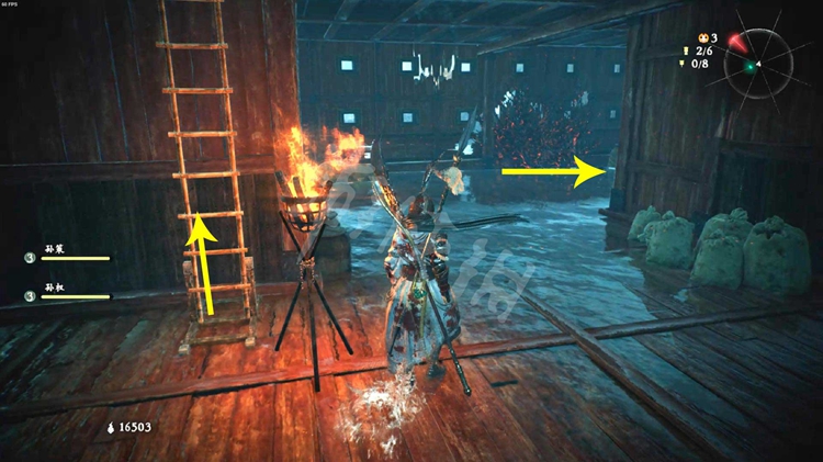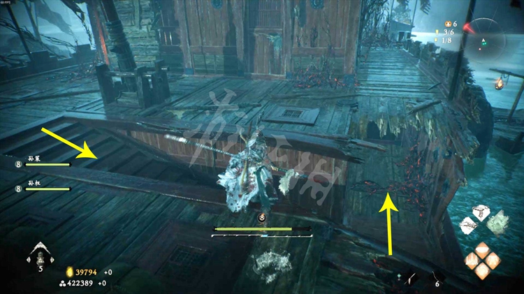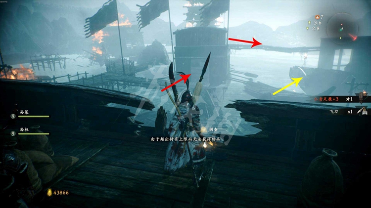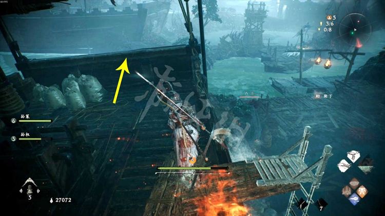 接下来有两条路线可以走。如下图,一是按红色箭头方向跳上楼船,走到后面爬上梯子,从上方的浮桥通过。