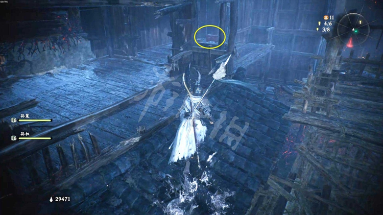 先跳到下图标记的船头上,往下看能找到一个金蝉之壳。