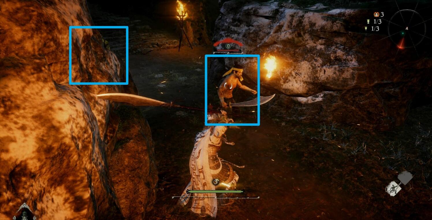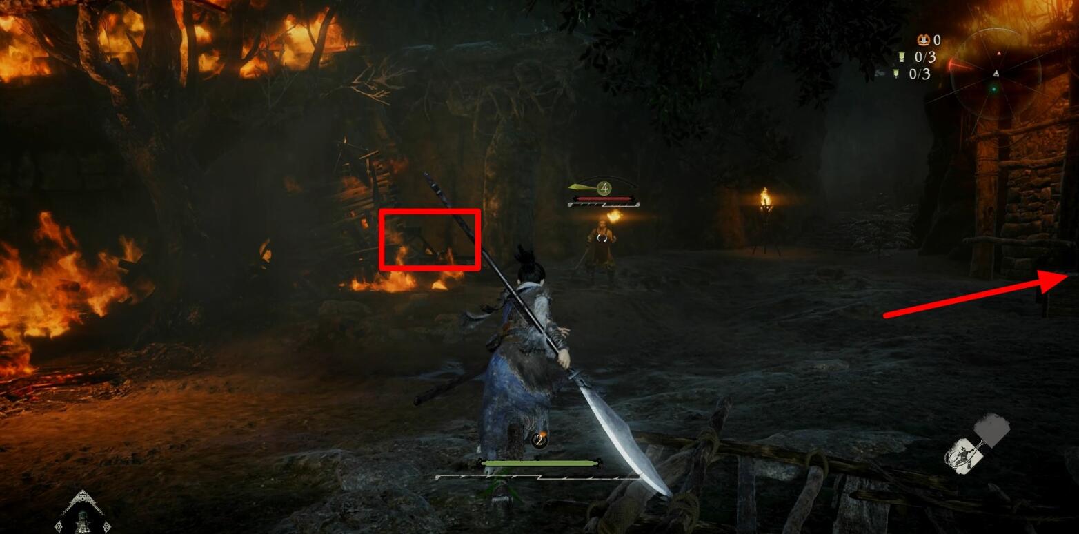 在右侧的旌旗底座旁还有两名敌人,首先跳至空中绝脉消灭下方拿火把的敌人,随后从后方绝脉消灭弓箭手即可。