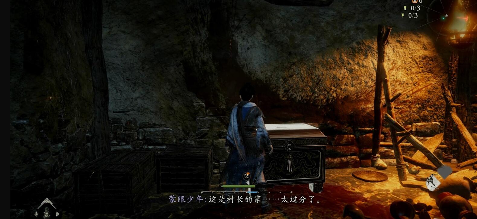 在村庄中救出一名蒙着双眼的少年后沿着小路前进,从最前方可以获得一个【真气碎片】,随后向左前进。